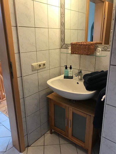 Im kleinen Badezimmer findet Ihr Dusche, Waschbecken, ein WC und flauschige Handtücher.