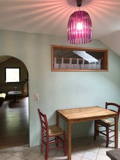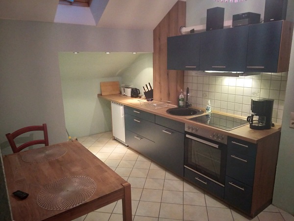 In der Küche befindet sich eine Essgarnitur, ein Kühlschrank, ein Herd mit Backofen sowie alle Basics an Geschirr, Töpfen, Koch- und Essbesteck.