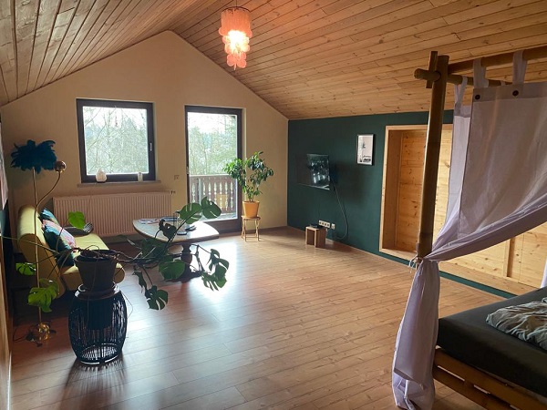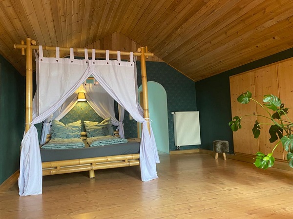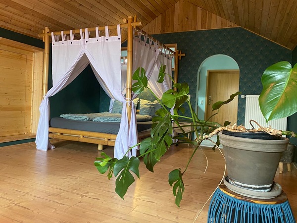 Wer die Ferienwohnung „Oahu“ bucht findet einen Südseetraum im geräumigen Loft-Style vor. Das Wohn- Schlafzimmer wurde mit viel Liebe zum Detail renoviert. Ein Bambus-Himmelbett sowie eine Schlafcouch bieten Platz für 2 bis 4 Personen.